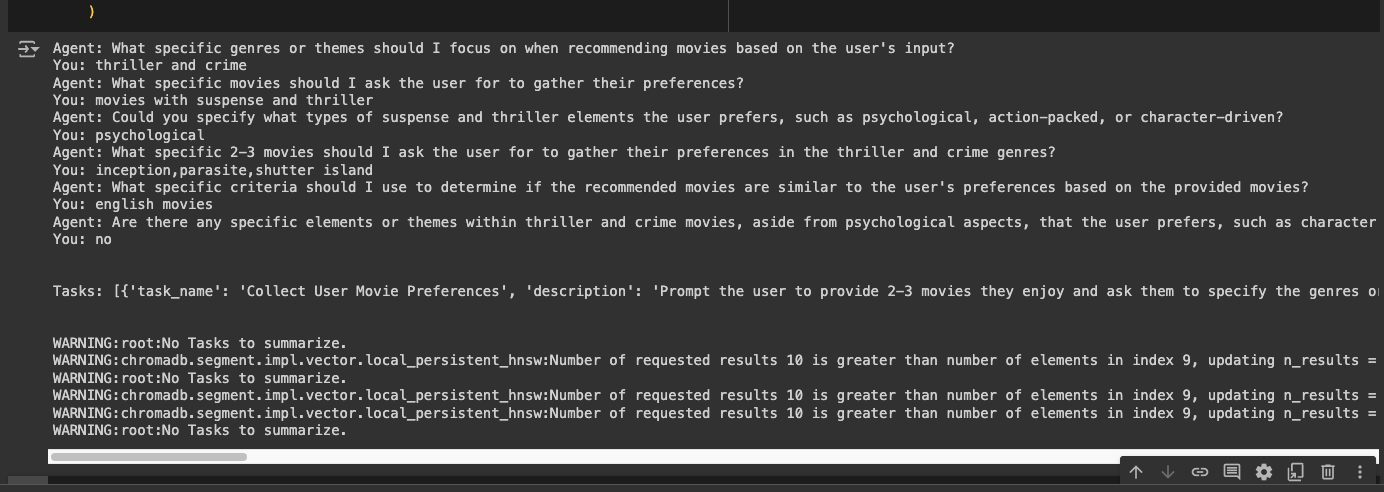 This documentation provides a detailed guide on how to implement a Movie Recommendation Agent using the OpenAGI framework. The system interacts with users to gather their movie preferences and offers personalized recommendations based on their input.
